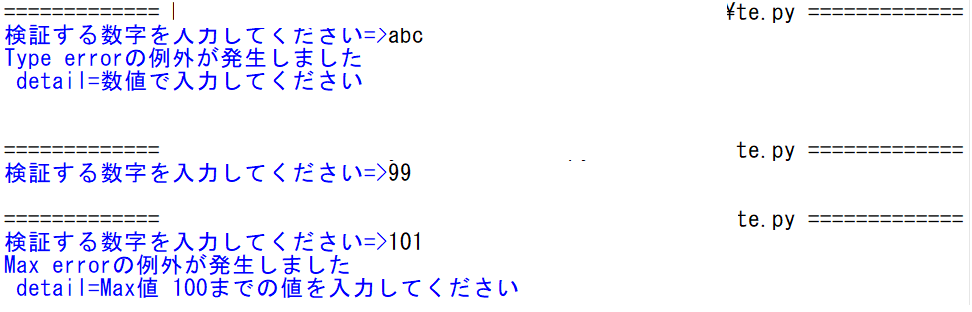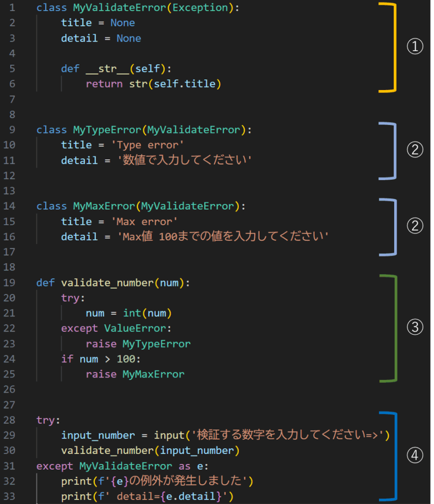 ④:try-exceptでMyValidateErrorを指定することで、MyTypeErrorとMyMaxErrorをまとめて捕捉