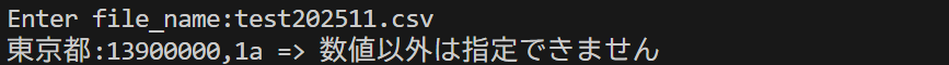 | “東京都”,”13900000″,”1a” #設定値に文字列が紛れ込んでしまっている “神奈川県”,”9200000″,”2616.10″ “千葉県”,”6200000″,”5157.50″ “埼玉県”,”7300000″,”3797.75″ |