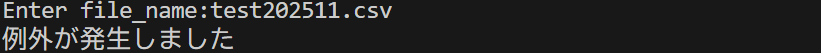 | import csv input_file_name = input(‘Enter file_name:’) try: with open(input_file_name, mode=’r’) as f: reader = csv.reader(f) for row in reader: population_desity = float(row[1]) / float(row[2]) print(f'{row[0]}の人口密度は{population_desity}です’) except FileNotFoundError: print(f’ファイルがありません’) except ZeroDivisionError: print(f'{row[0]}:{row[1]},{row[2]} => 値0は指定できません’) except ValueError: print(f'{row[0]}:{row[1]},{row[2]} => 数値以外は指定できません’) |