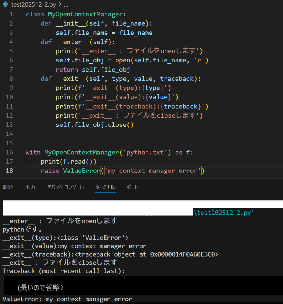 実行結果を見て頂けるとわかる通り、withブロックの中で例外が発生したとしても、__exit__() は必ず呼び出されます。この時、__exit__()には、classで設定しておいたtype, value, tracebackとして、発生した例外の情報が引き渡されるようになっています。なので、追加されたprint(f’__exit__(…):{…}’)で発生した例外を表示することができるようになります。